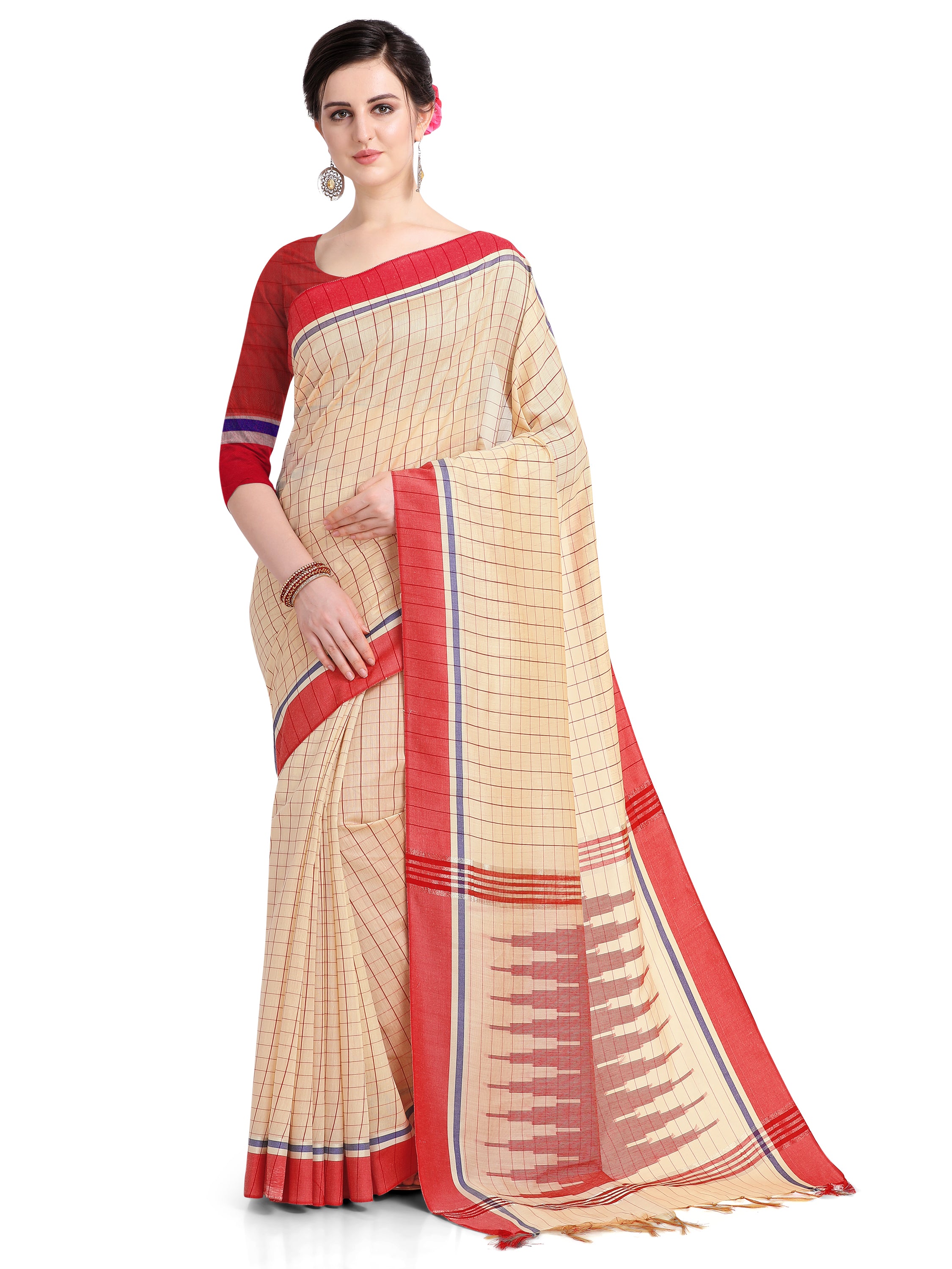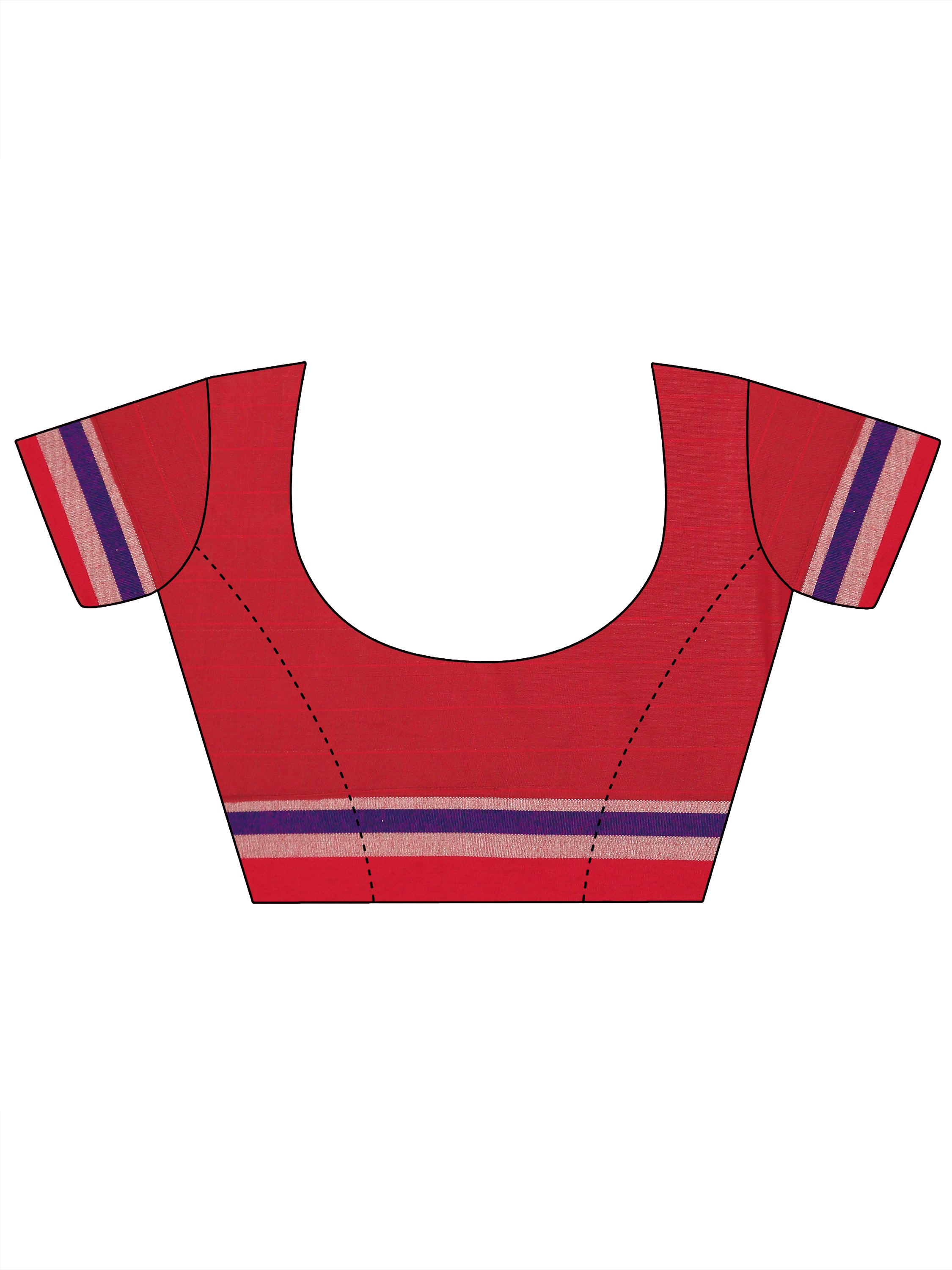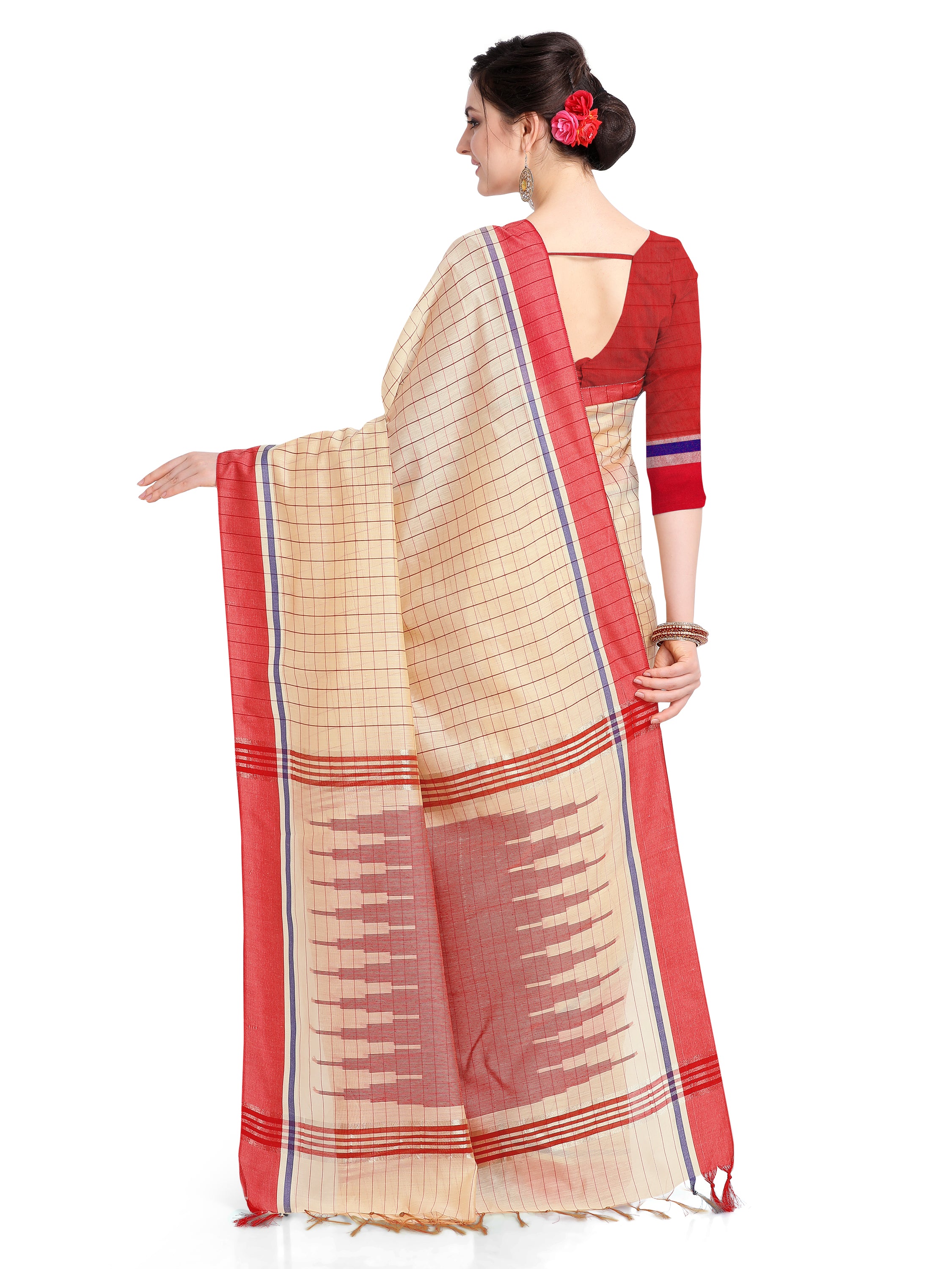 A delightful combination of blue, red and off-white in an truly ethnic way on this checks body and a dominating temple pallu, this saree is for the stong modern women who isn't afraid to stand out.