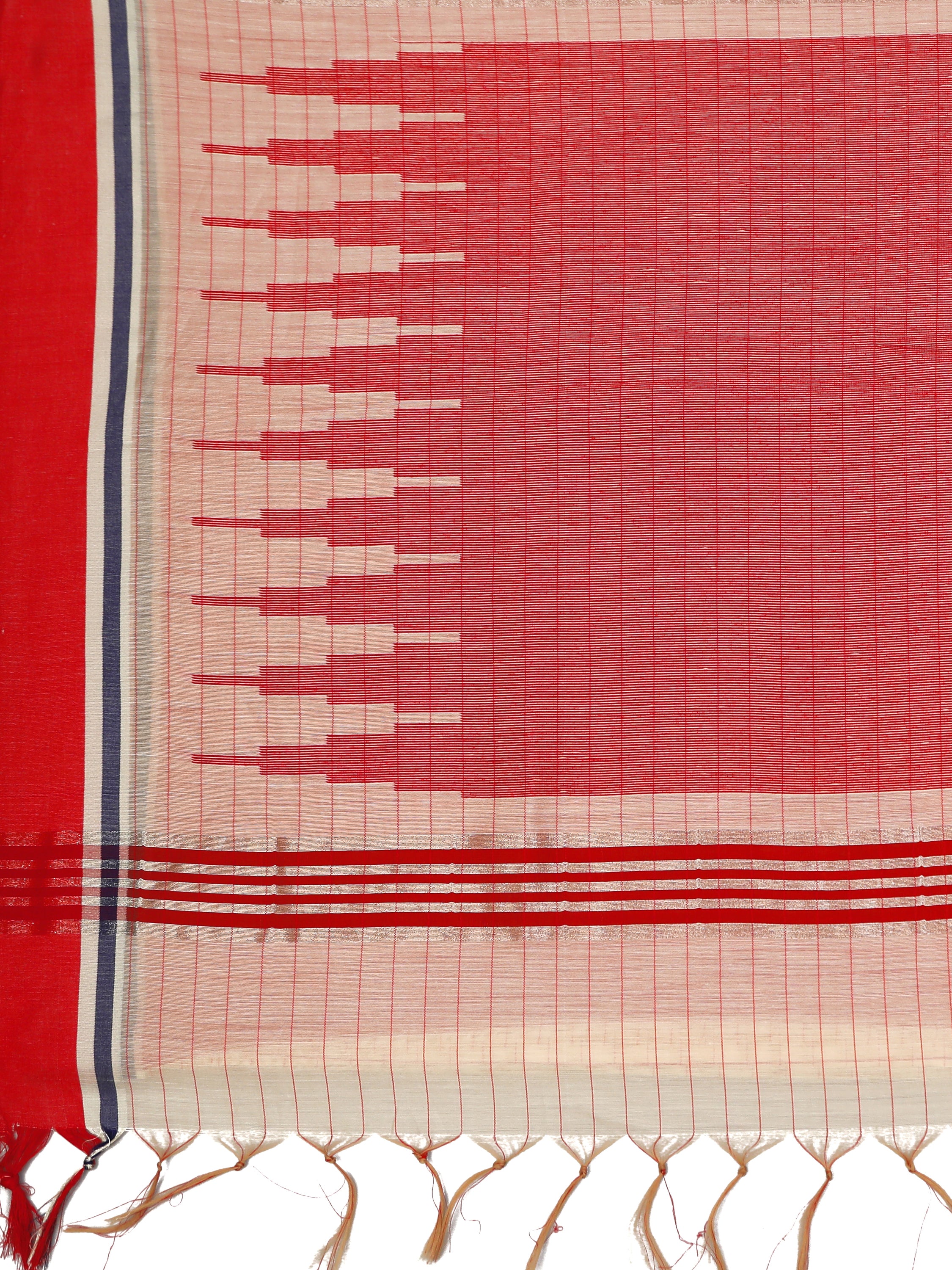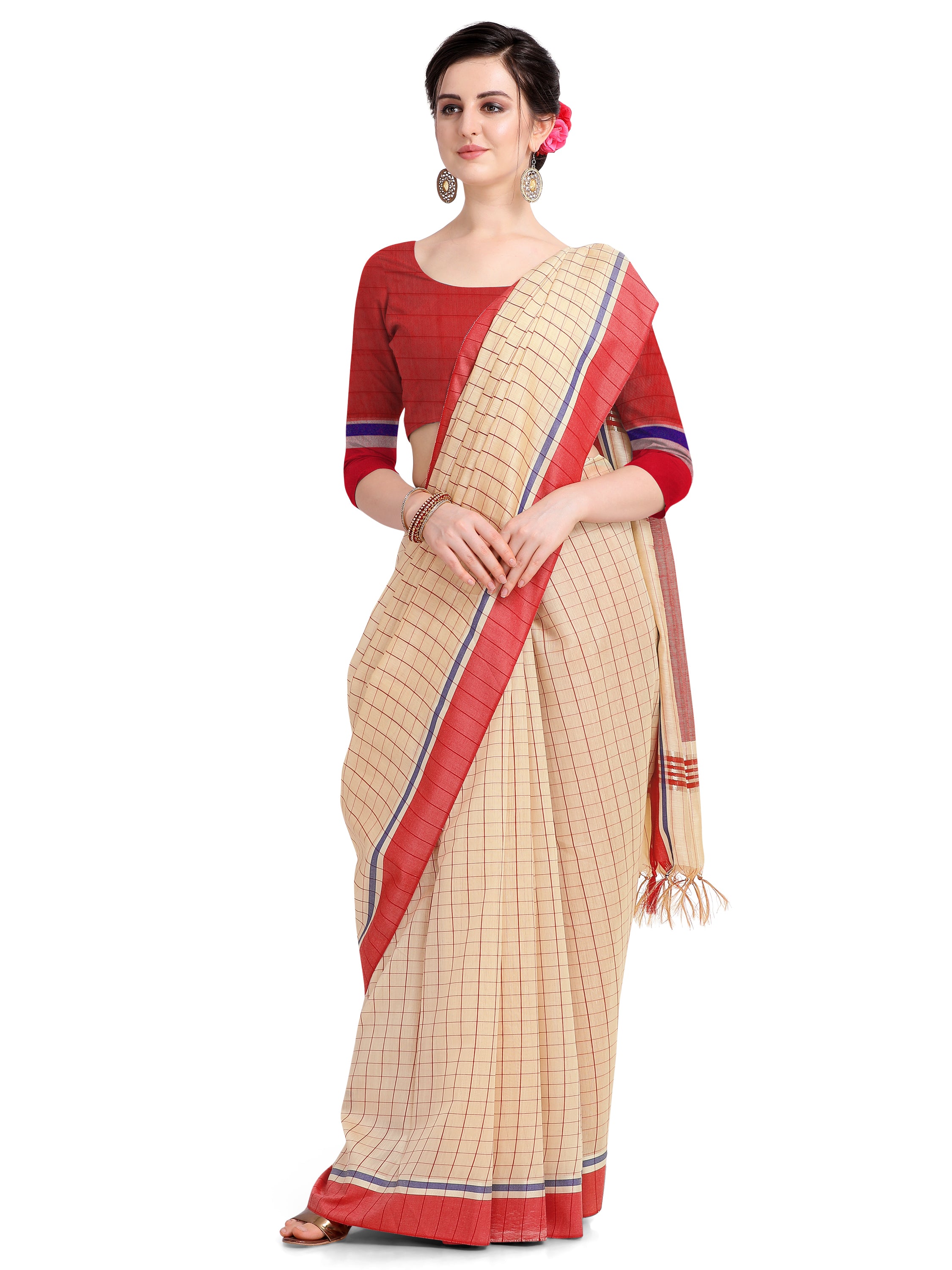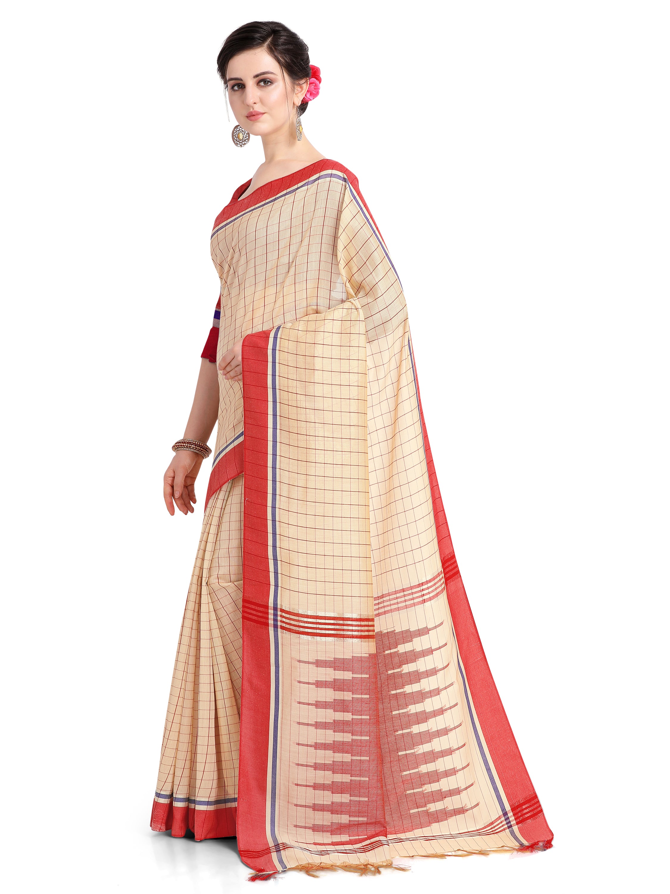 A delightful combination of blue, red and off-white in an truly ethnic way on this checks body and a dominating temple pallu, this saree is for the stong modern women who isn't afraid to stand out.